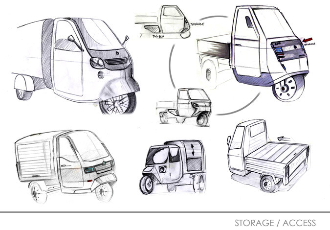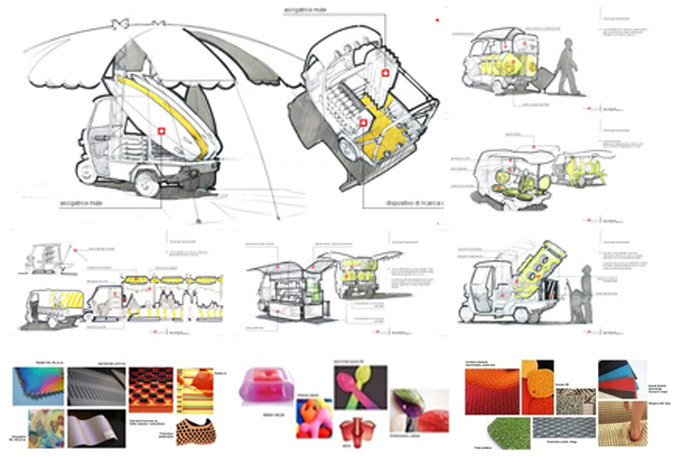 Proposte di diversi allestimenti per il veicolo ApeCar Piaggio, mirati a rivalorizzare l’immagine del marchio con nuovi prodotti